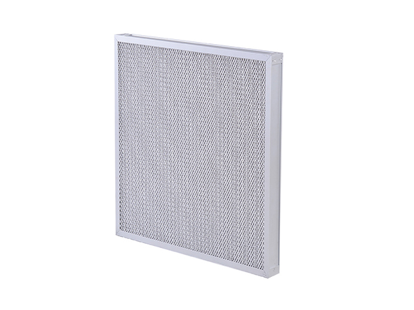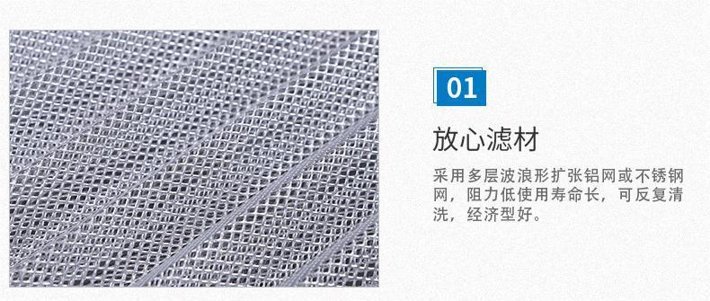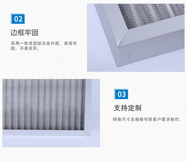 鋁波紋網(wǎng)過濾器采用多層鋁網(wǎng)經(jīng)輾壓成波浪形,以正確的角度彼此交叉疊合排列而成,多層金屬鋁波紋網(wǎng)是以不同的密度,孔徑由粗到細(xì)的排列,使空氣通過濾網(wǎng)時(shí)多次改變流動(dòng)方向,增大其集塵能力及效率。